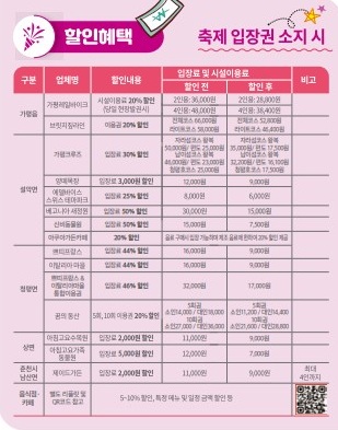 할인 대상 장소는 이미지 내 표 참조 (총 20여 개 장소, 최대 50% 할인)